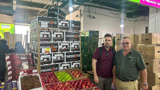Cornelius de Villiers and Renier Grobbelaar of Freshgold with their fruit in Malaysia.