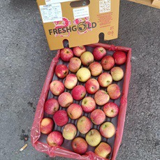 Right: Freshgold's new golden carton for the Chinese market with Fuji apples from Villiersdorp