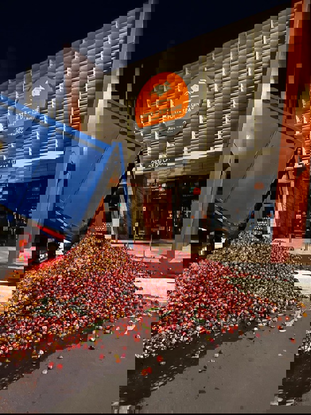 Fruit dumped in front of wholesaler Ets Barioux. The growers accuse the wholesaler of selling off French peaches and marketing products from Spain.