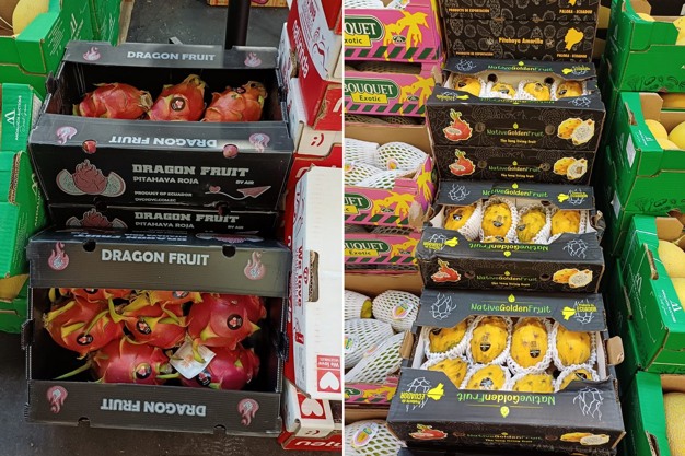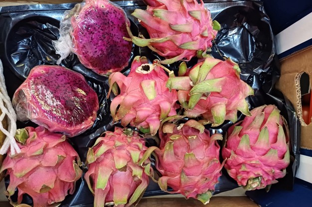 Red and yellow pitahaya from Ecuador is traded alongside Turkish produce.