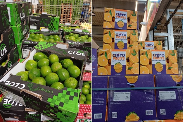 On the left: Tahitian limes, right: Valencia juice oranges from Egyptian.