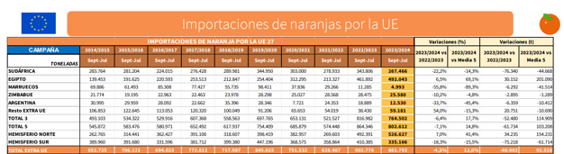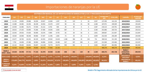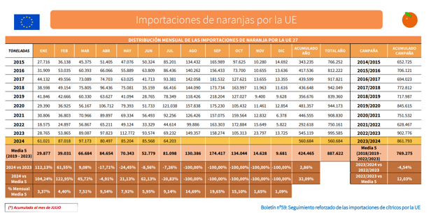 The latest monitoring report on citrus imports from third countries published by the Spanish Ministry of Agriculture, Fisheries and Food (MAPA) has revealed the latest information on the orange volumes purchased in the EU, with data up to the month of July.