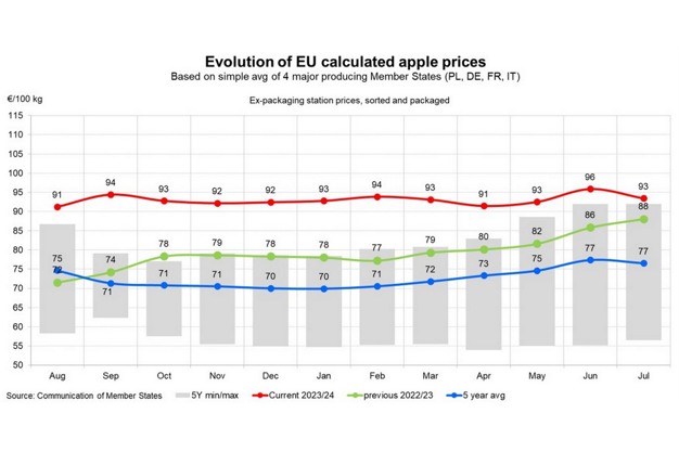 EU calculated apples prices in July, based on the simple average of the four major EU member states, came in at €93 /100 kgs, €3 lower compared to the month before.