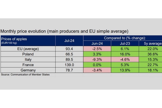 EU calculated apples prices in July, based on the simple average of the four major EU member states, came in at €93 /100 kgs, €3 lower compared to the month before.