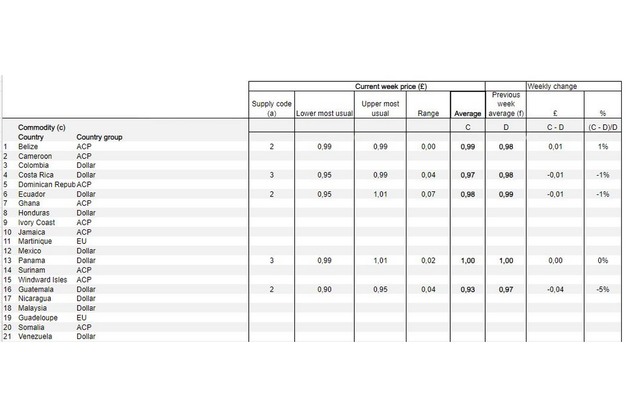 This series gives the average wholesale prices of bananas by country of origin. The prices are national averages of the most usual prices charged for bananas at wholesale markets in Birmingham and London. This publication is updated weekly.The current average week prices of bananas were at £0.99 for bananas from Belize, up 1% compared to last week, with bananas from Ecuador decreasing by 1% to £0.97 this week. Bananas from Panama came in at £1.00 / kg, up 0% compared to last week. Costa Rican bananas sold for £0.97, while bananas from Guatemala cost £0.97 this week.