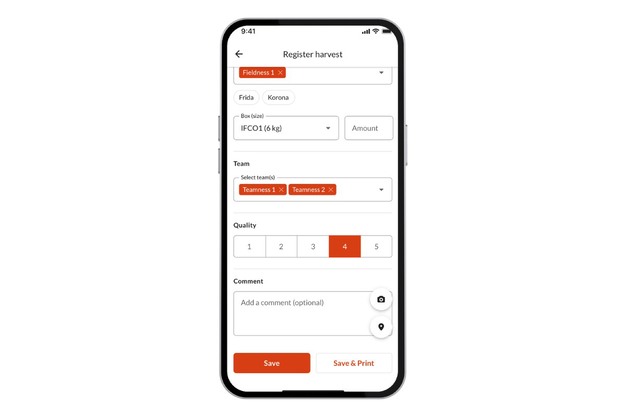 Register harvest batches with essential data points: field name, box size & box count or alternatively total weight, quality rating. The choice to add images, exact GPS coordinates and additional comments about each harvest batch.