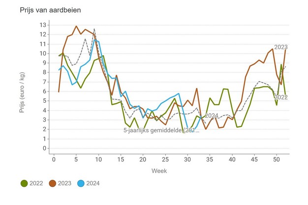 The strawberry price is recovering, climbing up from a summer low. At 3.44 euros per kilo in week 33, the price is now back to just below the five-year average. Grower Philip Van Overbeke signalled the price recovery, suggesting that supermarket promotions stimulating demand could be a possible reason.