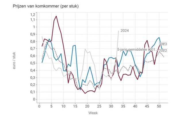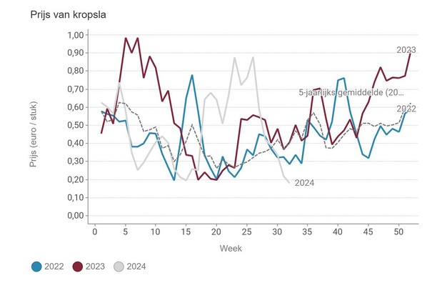 Last week, the median price of cabbage lettuce, another vegetable that thrives in summer weather, also rose. In recent weeks, the price had been low despite favorable weather, but at 45.4 euro cents per piece, the median price is now close to the 'normal' level for this time of year.