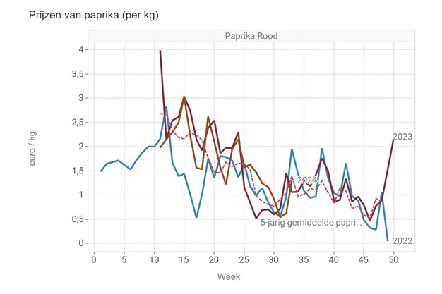 The increase in the red pepper price has not yet brought the median price above the five-year average. In week 33, red peppers averaged just under 1.30 euros per kilo, green peppers 1.28 euros, and yellow peppers 1.57 euros. The prices for yellow and green peppers have dropped slightly. It is mainly the doubling of the median price for red peppers that stands out.