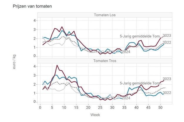 A small increase in the median prices for loose tomatoes and vine tomatoes does not yet bring the price above the five-year average at VBT in week 33. An average price of 51 euro cents per kilogram for loose tomatoes and 47 euro cents per kilogram for vine tomatoes is still not sufficient. However, the cucumber price is experiencing a significant rebound, and red pepper prices are also rising.