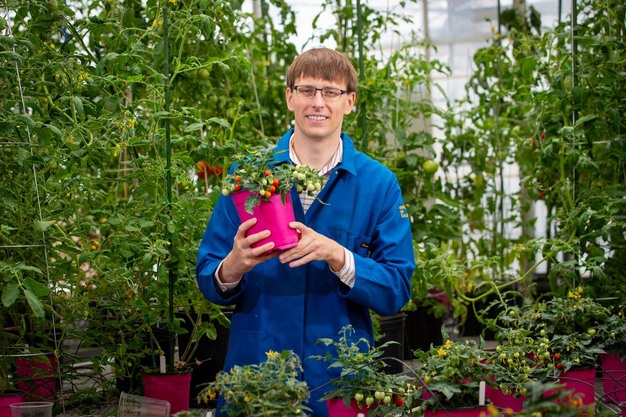 Associate Professor Robert Jinkerson showing space tomatoes in the greenhouse. Photo: Stan Lim.