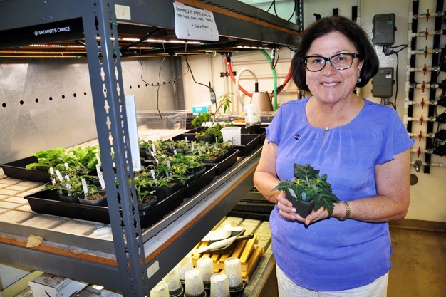 Martha Orozco-Cardena holds a blossoming tomato plant in the laboratory. Photo: David Danelski.