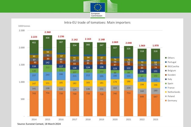 The chart above shows that Germany is the largest importer of tomatoes in the EU. Since 2022, with the start of the crisis in Ukraine, imports have been on the decline. (Source: European Commission).