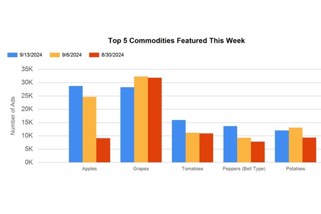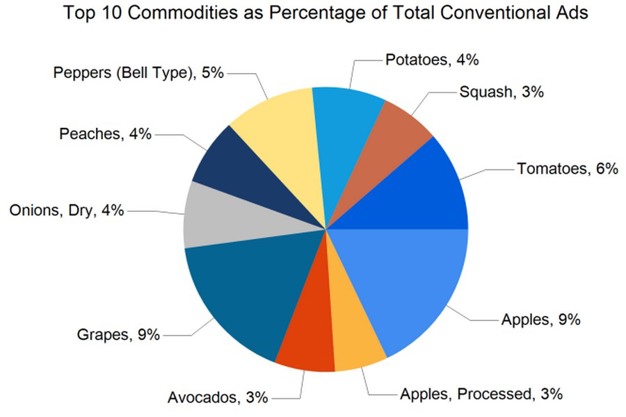 Total ad numbers this week were 302,585, a 5% increase from last week's total of 289,351. The total for the same week last year was 11% lower at 272,431. The total number of ads broken out by commodity groups: fruit 154,271 (51% of all ads), onions and potatoes 23,797 (8%), vegetables 119,864 (34%), herbs 3,288, ornamentals 2,535, and hemp 2,118. The number of ads for organic produce was 40,859, 14% of total ads.