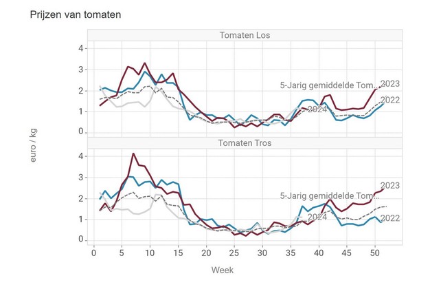 That price rise did stagnate in week 37. For loose tomatoes that means 1.11 euros per kilo, and for vine tomatoes we see the same average price in the price overview of the Federation of Belgian Horticultural Cooperatives.