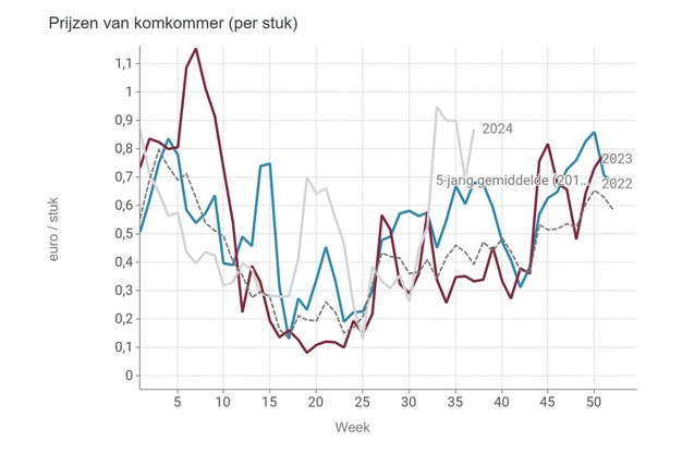 In week 37, cucumber prices at Belgium auction VBT were again high. The drop in price the week before proved short-lived. An average price of almost 87 euro cents each is still twice as high as usual. Tomato prices are also a (small) bit above the five-year average, after a modest price rise in recent weeks.