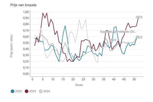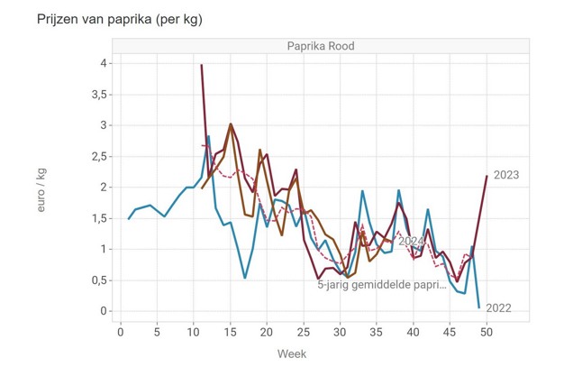 For peppers, prices last week were close to the five-year average. For red this means 1.12 euros per kilo in week 37, for yellow 1.37 euros per kilo and for green 1.23 euros per kilo.