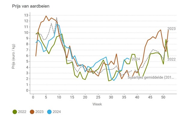 The average price for strawberries has been neatly above 5 euros per kilo for the past three weeks. Compared to recent years, a neat price. Over week 37, an average of 5.43 euros per kilo was paid.