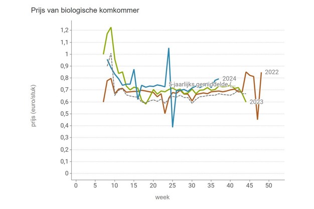 The average price for organic cucumbers has been above the five-year average all summer, and also higher than in recent years. Over 79 euro cents each was paid over week 37.