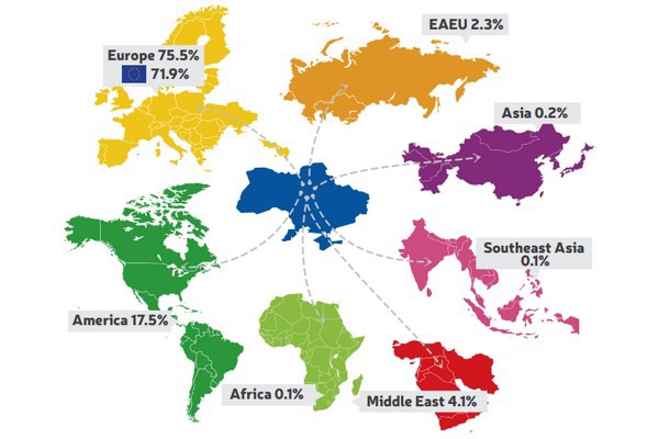 When it comes to fruit exports from Ukraine, certain similarities can be noted. Comparably to the vegetable exports, Europe sees the most fruit exports from Ukraine, with 75.5%. A large sum of this amount can be attributed to the European Union, with 71.9%. Running up is America, accounting for 17.5% of fruit exports.