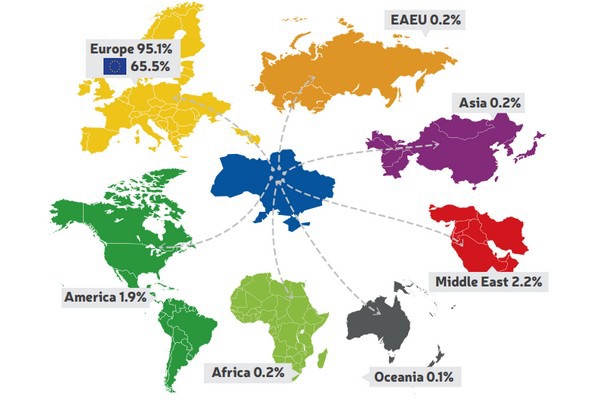 Ukraine's largest export partner for vegetables is Europe, accounting for 95.1% of total vegetable exports. From the 95.1%, the European Union is worth 65.5% of exports. Furthermore, the second biggest continent in terms of exports from Ukraine can be seen in the Middle East, with 2.2%.
