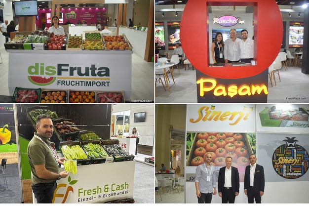 German-Turkish companies at Interfresh Eurasia 2023. Clockwise: The stand of Disfruta GmbH, Tufan Ünal (m) from Meta GmbH, Saban Cetin (m) from Cetinaya GmbH in Bremen, Cevdet Cavusoglu from the Wuppertal-based company Fresh & Cash.