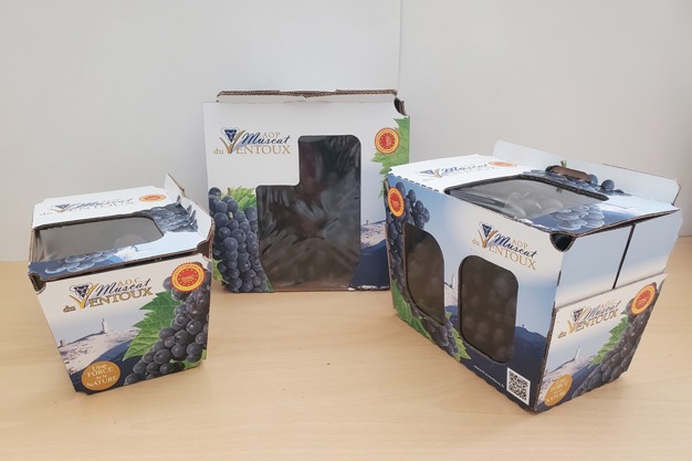 The new Muscat du Ventoux trays are made of cardboard with starch windows, available in three sizes: two 750g options and one 500g.