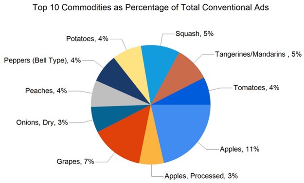 Total ad numbers this week were 269,521, a 11% decrease from last week's total of 302,585. The total for the same week last year was 10% higher at 244,947. The total number of ads broken out by commodity groups: fruit 142,141 (53% of all ads), onions and potatoes 18,677 (7%), vegetables 104,883 (39%), herbs 947, ornamentals 1,438, and hemp 2,382. The number of ads for organic produce was 29,790, 11% of total ads.