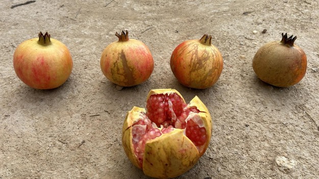 From left to right, pomegranates affected by the South African thrips pest this season (in order of aesthetic deterioration), and an open pomegranate to showcase its excellent and usual quality.