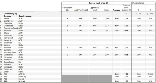 This series gives the average wholesale prices of bananas by country of origin. The prices are national averages of the most usual prices charged for bananas at wholesale markets in Birmingham and London. This publication is updated weekly. All prices are in pounds (£ ) per kg.