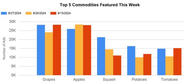 It was an eventful week at grocery stores this week, with multiple produce promotional opportunities for retailers. Rosh Hashanah takes place next week, and stores were stocked with celebratory staples such as pomegranates, leeks, beets, carrots, honey, and apple and grape juices. Football season is in full swing, and tailgating favorites like fruit and vegetable snack trays, lemons, limes, baby carrots, and bell peppers were in the starting lineup. National Hispanic Heritage Month was recognized in several flyers, featuring sales of tomatillos, onions, Roma tomatoes, cilantro, jalapeno peppers, plantains, cactus pads, mangos, papayas, and sweet corn. Cranberries made their first appearance in flyers this week, joining the abundant displays of hard squashes, pumpkins, and apple cider to celebrate the official arrival of autumn.