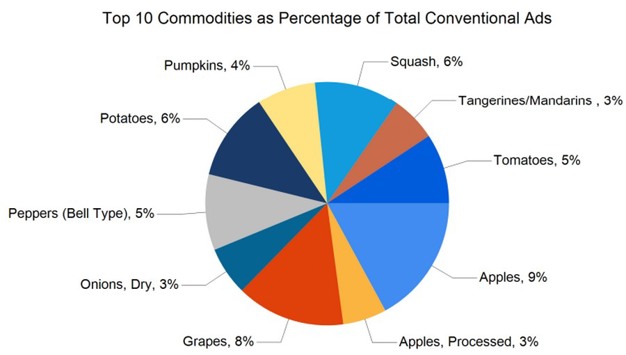 Total ad numbers this week were 295,942, a 10% increase from last week's total of 269,521. The total for the same week last year was 2% lower at 288,813. The total number of ads broken out by commodity groups: fruit 141,883 (48% of all ads), onions and potatoes 25,686 (9%), vegetables 125,397 (42%), herbs 1,436, ornamentals 1,455, and hemp 1,521. The number of ads for organic produce was 42,945, 15% of total ads.