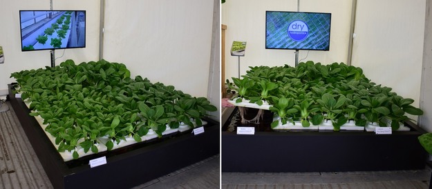 Pak choi grows well in hydroponic systems. Sakata showcases three varieties of hydroponically grown pak choi. For the Dutch market, pak choi with white stems is in demand. This includes the longer-stemmed Joi Choi and two shorter-stemmed white varieties, You Qing Choi. For UK consumers, the green-stemmed variety, Yang Qing Choi, was developed. These varieties form strong root systems in water (visible on the right in the photo) and are resistant to clubroot.