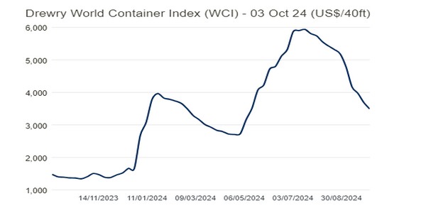 The latest Drewry WCI composite index of $3,489 per 40ft container is 66% below the previous pandemic peak of $10,377 in September 2021, but it is 146% more than the average 2019 (pre-pandemic) rate of $1,420.