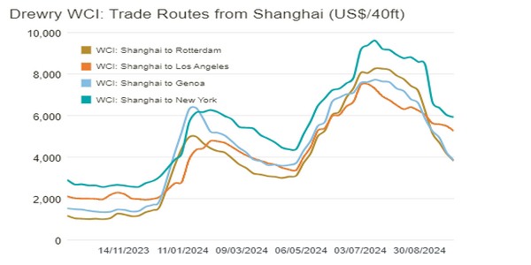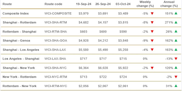 Freight rates from Shanghai to Genoa decreased 9% or $364 to $3,848 per 40ft container. Similarly, rates from Shanghai to Rotterdam declined 8% or $342 to $3,815 per feu. Likewise, rates from Shanghai to Los Angeles dropped 4% or $232 to $5,258 per 40ft box. Also, rates from Shanghai to New York and Rotterdam to Shanghai fell 2% to $5,922 and $590 per feu respectively. Meanwhile, rates from New York to Rotterdam, Rotterdam to New York and Los Angeles to Shanghai remain stable. Drewry expects increases in rates from China and Europe to the US East Coast in the coming weeks due to the ILA port strike.