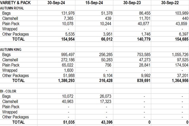 Between September 15 and September 30, 2024, there was a marked escalation in the cold storage holdings of the Autumn King grape variety in the United States, elevating from 316,428 packages to 1,386,293 packages, compared to 839,691 one year ago.