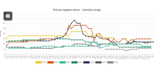 Currently, Ukrainian orchardists are offering apples for sale at 15-22 UAH/kg ($0.36-0.53/kg), depending on the variety, quality, and batch volume, which is, on average, 23% higher than at the end of last week. Moreover, the newly established wholesale prices for apples in Ukraine have already reached the highest level in at least the last seven years!