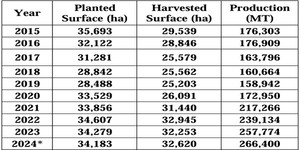 Mexico's 2024 peach production is forecast at 266,400 metric tons (MT), a three percent increase over 2023, driven by increased domestic consumption and stagnant imports. Over the past decade, Mexico's peach industry has experienced notable fluctuations in both planted and harvested areas, with a general decline until around 2019, followed by a gradual increase. Production has been increasing in recent years, despite varying planted area, reflecting yield improvements due to enhanced agricultural practices, improved varieties, favorable climatic conditions, access to water, and consumer awareness. Mexico's peach consumption is covered primarily by domestic production and supplemented by minimal imports mainly from the United States and Chile. U.S. peach exports to Mexico are primarily from May to October.