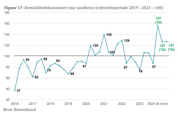 The profitability barometer for strawberries is highly volatile. The increase in the profitability index in 2024 stems from a combination of increased prices and increased production, which was mainly in the 1st quarter of 2024. The profitability index in 2024 is quite above the average of the past 5 years.