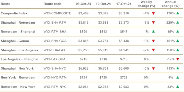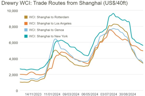 The latest Drewry WCI composite index of $3,216 per 40ft container is 69% below the previous pandemic peak of $10,377 in September 2021, but it is 126% more than the average 2019 (pre-pandemic) rate of $1,420.