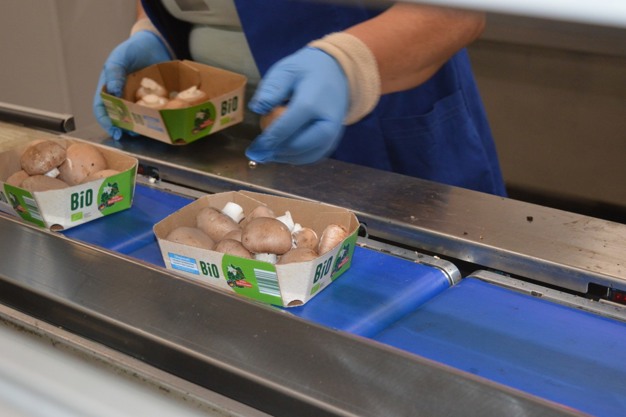 Both the organic and conventional cultivated mushrooms are packaged in cardboard or plastic trays immediately after harvesting, in line with market requirements and customer wishes