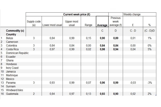 Prices in British pounds (£) per kg for week 42 Current average weekly banana prices were £0.90 (€1.08) for bananas from Belize, an increase of 1% compared to last week. The price for bananas from Colombia this week was £0.84 (€1.00), the same price as last week. Bananas from Costa Rica reached £0.98 (€1.17) per kg, a price increase of 5% compared to last week. Bananas from Panama sold for £0.96 (€1.15), down 3%, while bananas from Guatemala cost £0.93 (€1.11) this week, up 2%.
