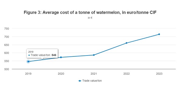 Watermelons are mainly imported into Europe by sea or by road, which are both very cost-effective means of transportation. The average cost of a tonne of watermelon imported from non-European countries has steadily risen since 2019. In 2019, the average cost (Cost, Insurance and Freight – CIF) of a tonne of watermelon was €546/tonne. In 2023, this cost was €714/tonne, which represents an increase of a little more than 30%