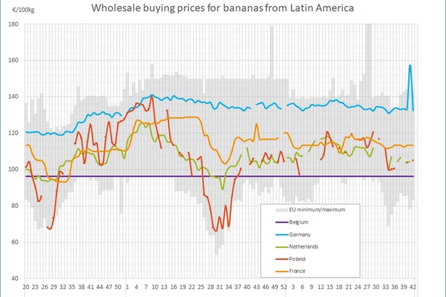 In week 42, the average wholesale price of bananas from Latin America remained stable at €207.5/100 kgs in Spain, with prices in France remaining at €104/100 kgs.