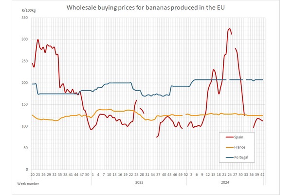 In week 42, the average wholesale price of European bananas stood at €113 per 100 kgs in Spain, while Portugal remained steady at €208 per 100 kgs.
