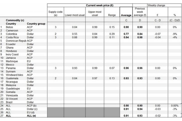 The report compares average prices for bananas from countries like Belize, Colombia, Costa Rica, and Ecuador. Belize's banana prices remained stable, showing no change from the previous week, staying at £0.90 per kilogram. Meanwhile, prices for bananas from Colombia and Costa Rica saw slight drops. Costa Rican bananas fell by 4.5%, with the price per kilogram decreasing from £0.98 to £0.94. Similarly, Colombian bananas recorded a decline of 8.5%, with prices now at £0.77 per kilogram, down from £0.84.