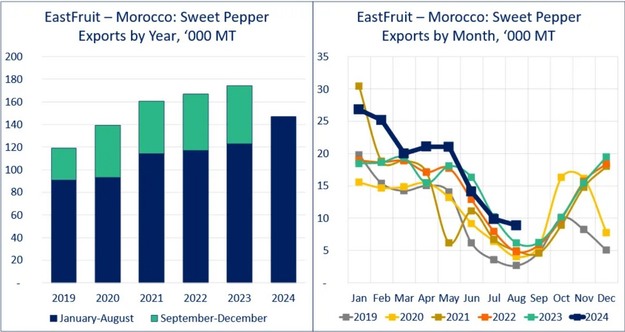 There has been a notable surge in direct exports of Moroccan bell peppers to the United Kingdom, which have increased fivefold from 2019 to 2023. Switzerland is another important market in Europe, with 2.7 thousand tons of bell peppers exported there from January to August this year.