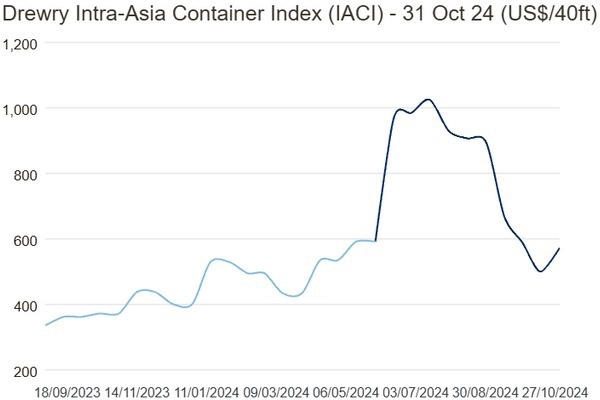 Drewry's Intra-Asia Container Index (IACI) rose 15% in the last 2 weeks of October, to $573 per 40ft container, the first uptick after six consecutive fortnights of decline since mid-July. Drewry expects this upward trend to continue in November due to the pre-Christmas cargo rush.