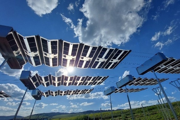 VitiCult project in Geisemheim, Germany, using Mirai Solar's photovoltaic shading system (field view). Reference: https://www.ise.fraunhofer.de/en/research-projects/viticult-pvmobil.html
