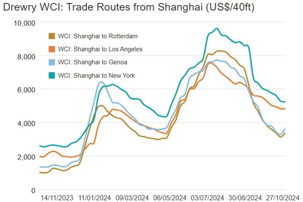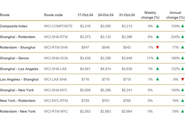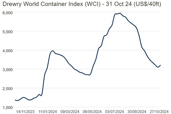 The Drewry WCI composite index increased 4% to $3,213 per feu, which is 69% below the previous pandemic peak of $10,377 in September 2021 but 126% more than the average 2019 (pre-pandemic) of $1,420.